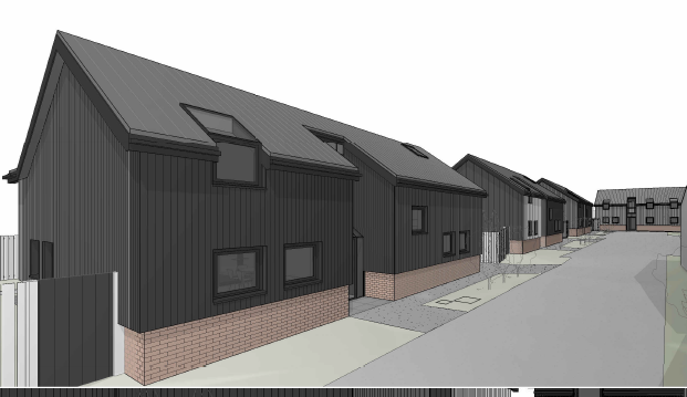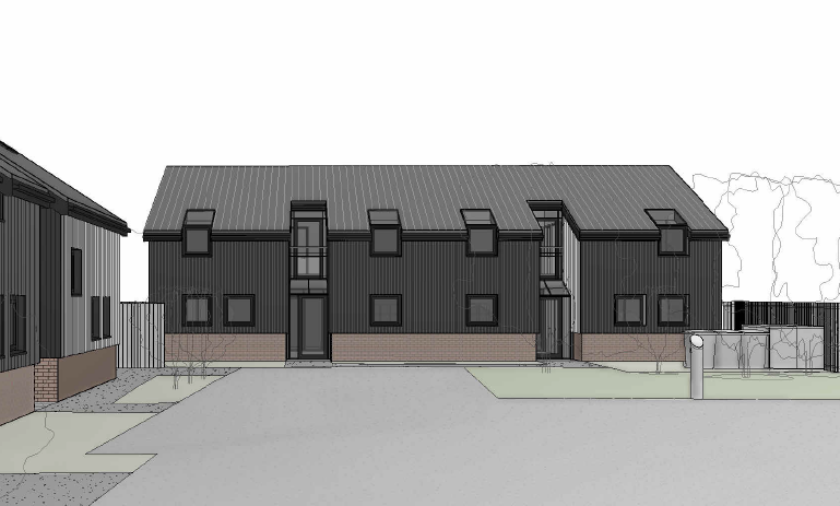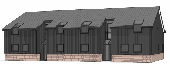 The homes showcase a striking blend of black cladding and warm brickwork, pitched roofs with skylights. Recessed entrances and subtle balconies add depth and privacy, while landscaped frontages and paved walkways create a refined streetscape.